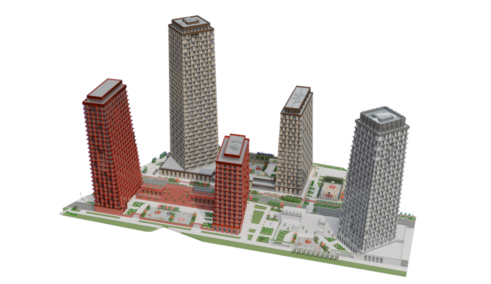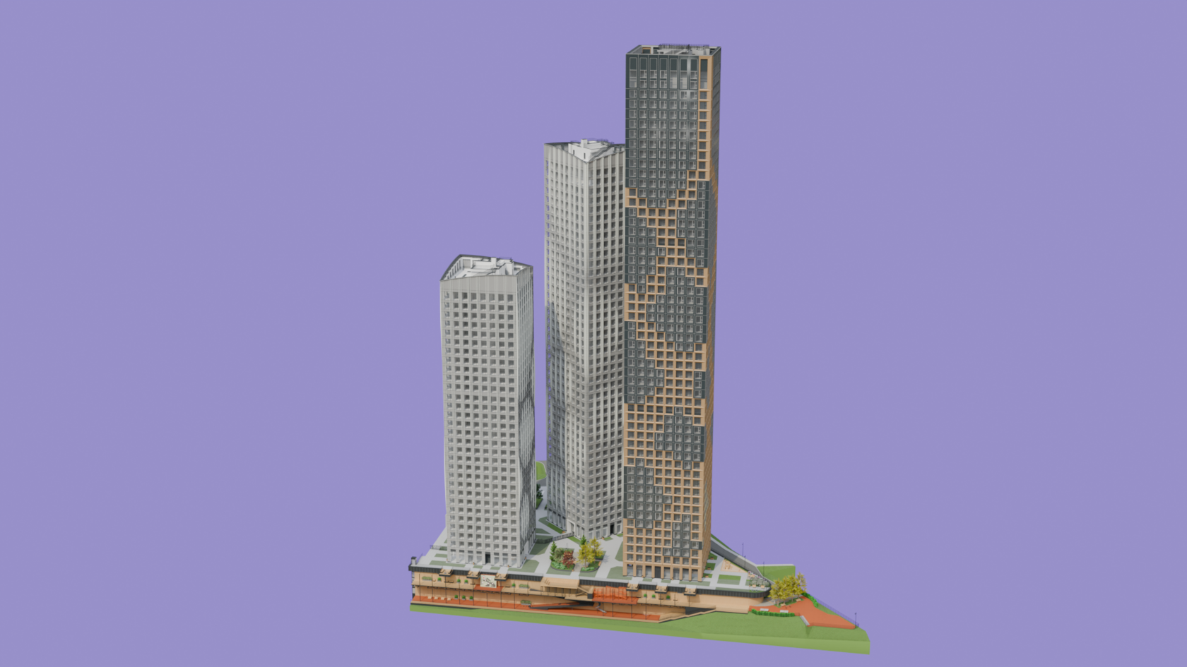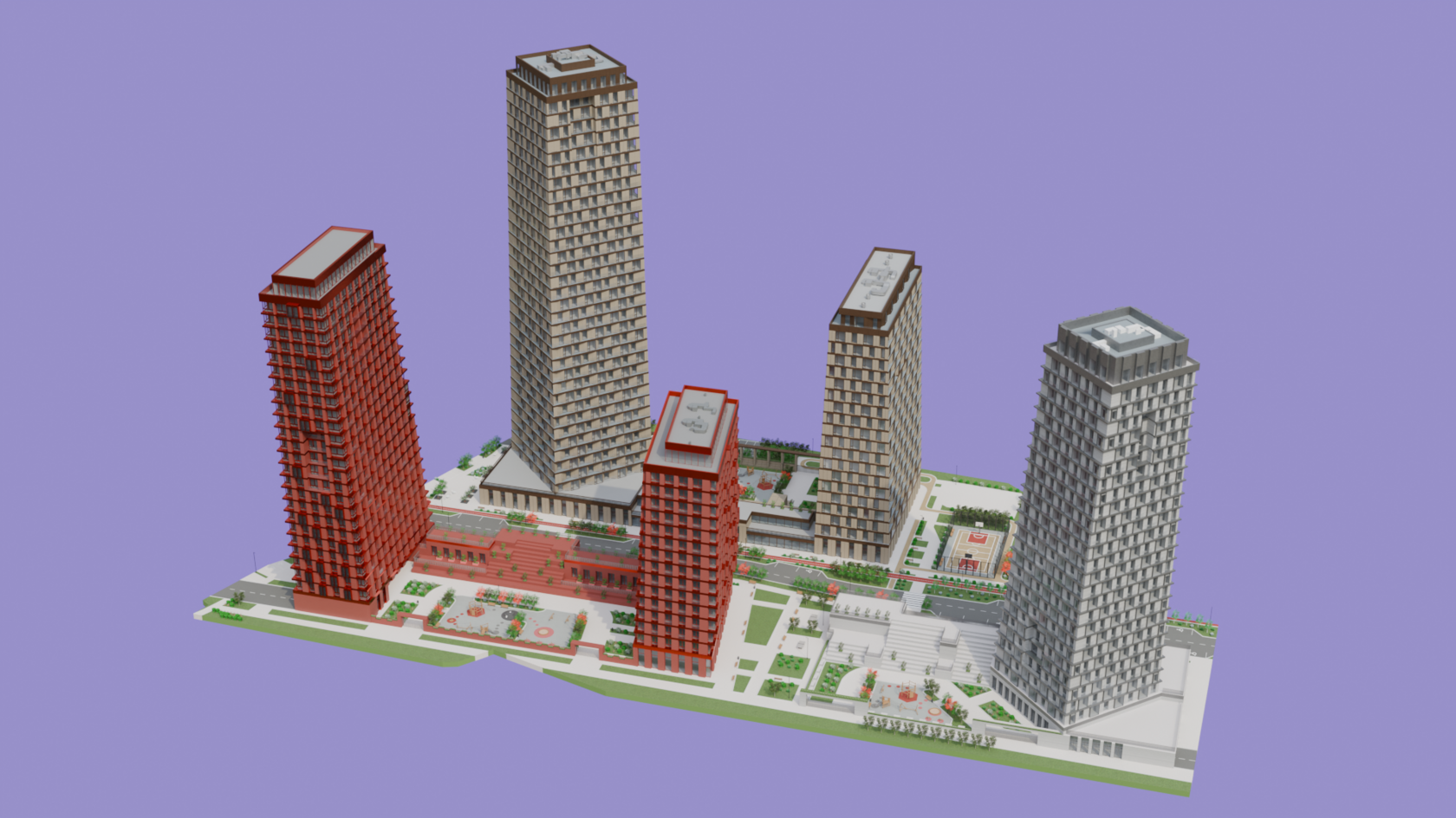 Комплекс зданий состоит из трех зданий, включающих в себя несколько корпусов, объединённых между собой стилобатами. Здания имеют форму, приближённую к параллелепипедам, с ориентировочными размерами: 1. 40×110м и высотой 90 м, 2. 114х43м и высотой 120 м, 3. 85х35м и высотой 90 м.